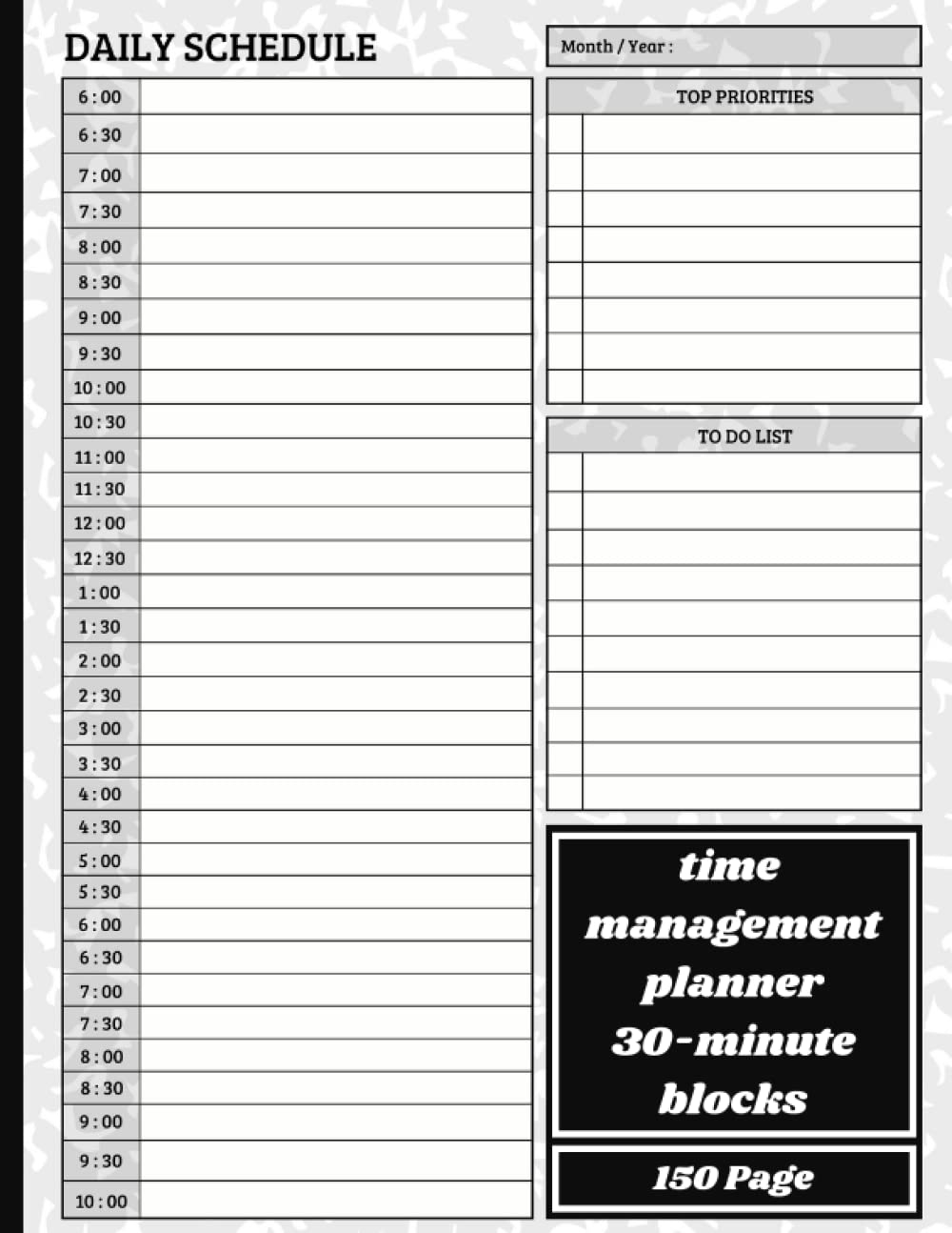 Review and adjust your 30-minute schedule template regularly to ensure that you’re staying on track and making progress towards your goals. Be flexible and willing to adapt your schedule as needed to accommodate changes or unexpected events. Remember that the goal of a schedule is to help you manage your time effectively, not to create additional stress or rigidity in your day.