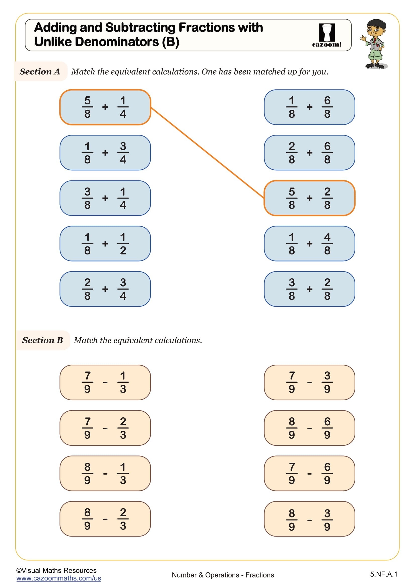Learning how to add and subtract fractions is an important skill in mathematics. When fractions have different denominators, they are considered unlike fractions. To help students practice this concept, adding and subtracting unlike fractions worksheets can be a useful tool.