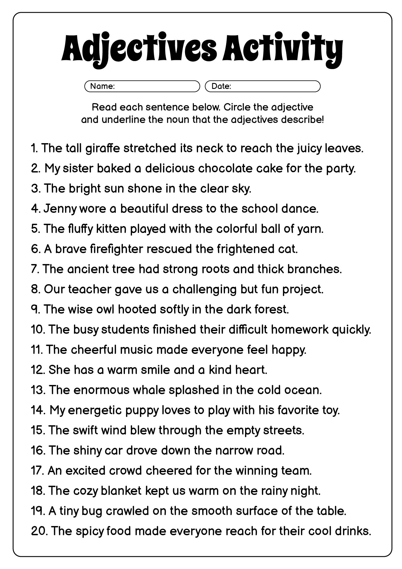 One effective way to practice using adjectives is through worksheets. These worksheets provide students with various exercises and activities that allow them to identify, use, and understand adjectives in context. They are a valuable tool for teachers to assess students’ understanding of adjectives and provide targeted practice.