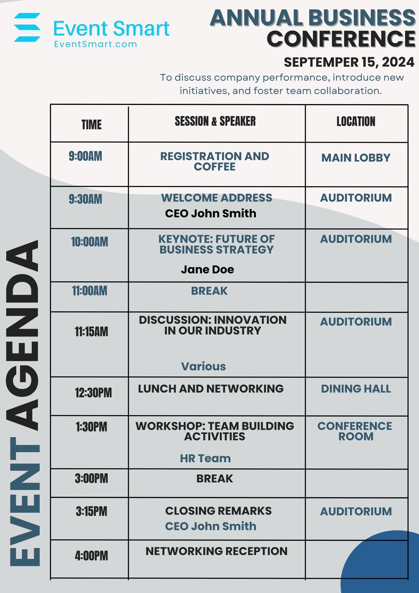 Here is a basic agenda template that you can customize for your event: