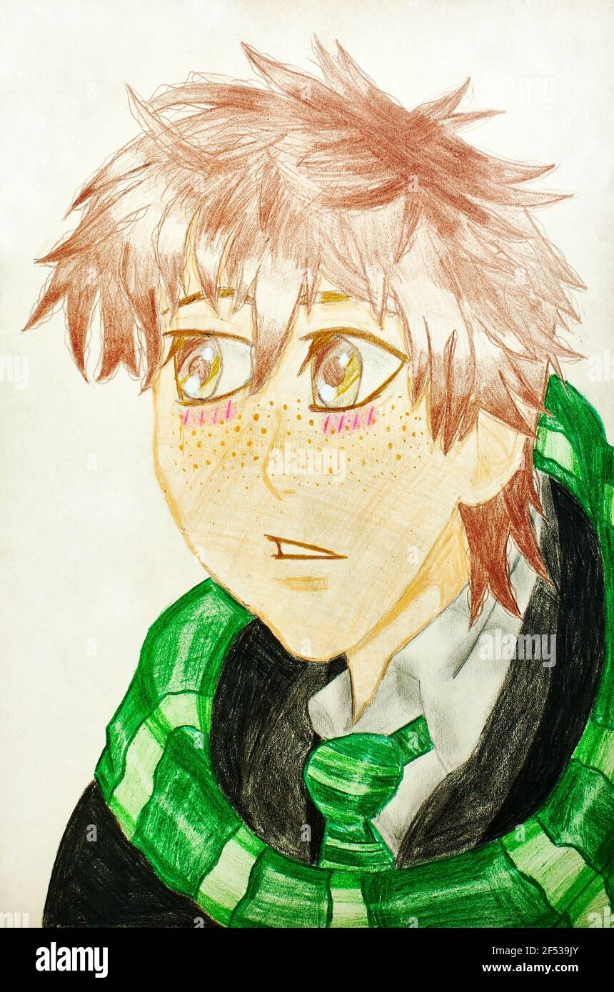 Drawing In The Style Of Anime Boy Drawing Colored Pencil Stock
