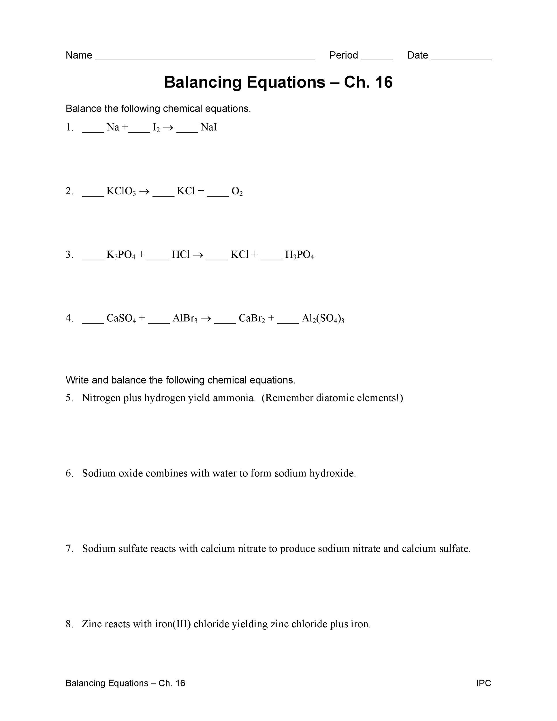 One effective way to practice and master the skill of balancing equations is through worksheets. Balancing equations chemistry worksheets provide students with numerous equations to balance, allowing them to practice and improve their skills in a structured and systematic way. These worksheets often include a variety of chemical reactions, from simple to complex, to challenge students at different levels.