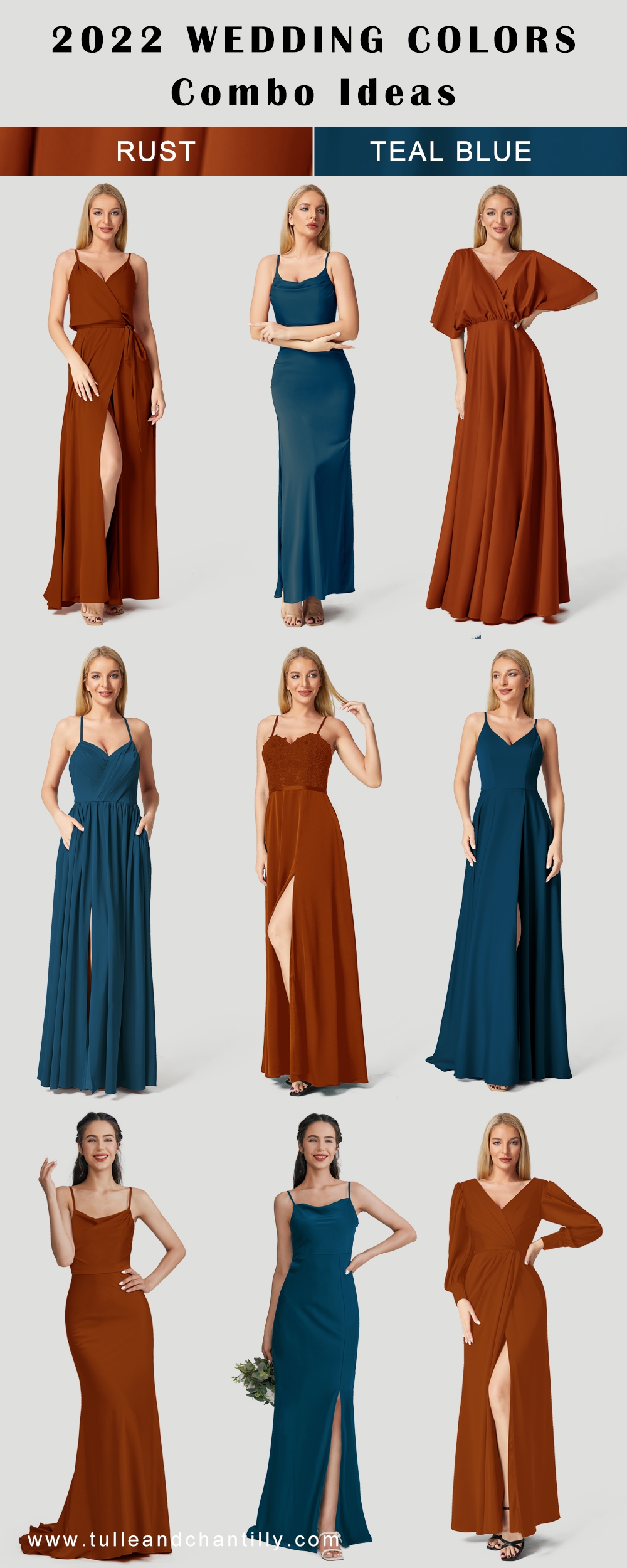 If you’re planning a more formal affair, consider a teal satin gown with a sweetheart neckline and a full skirt. This classic silhouette is timeless and will make your bridesmaids feel like royalty as they walk down the aisle.