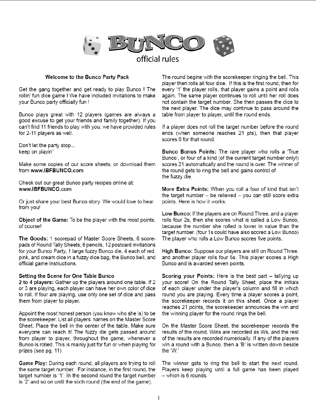 Bunco Rules Printable