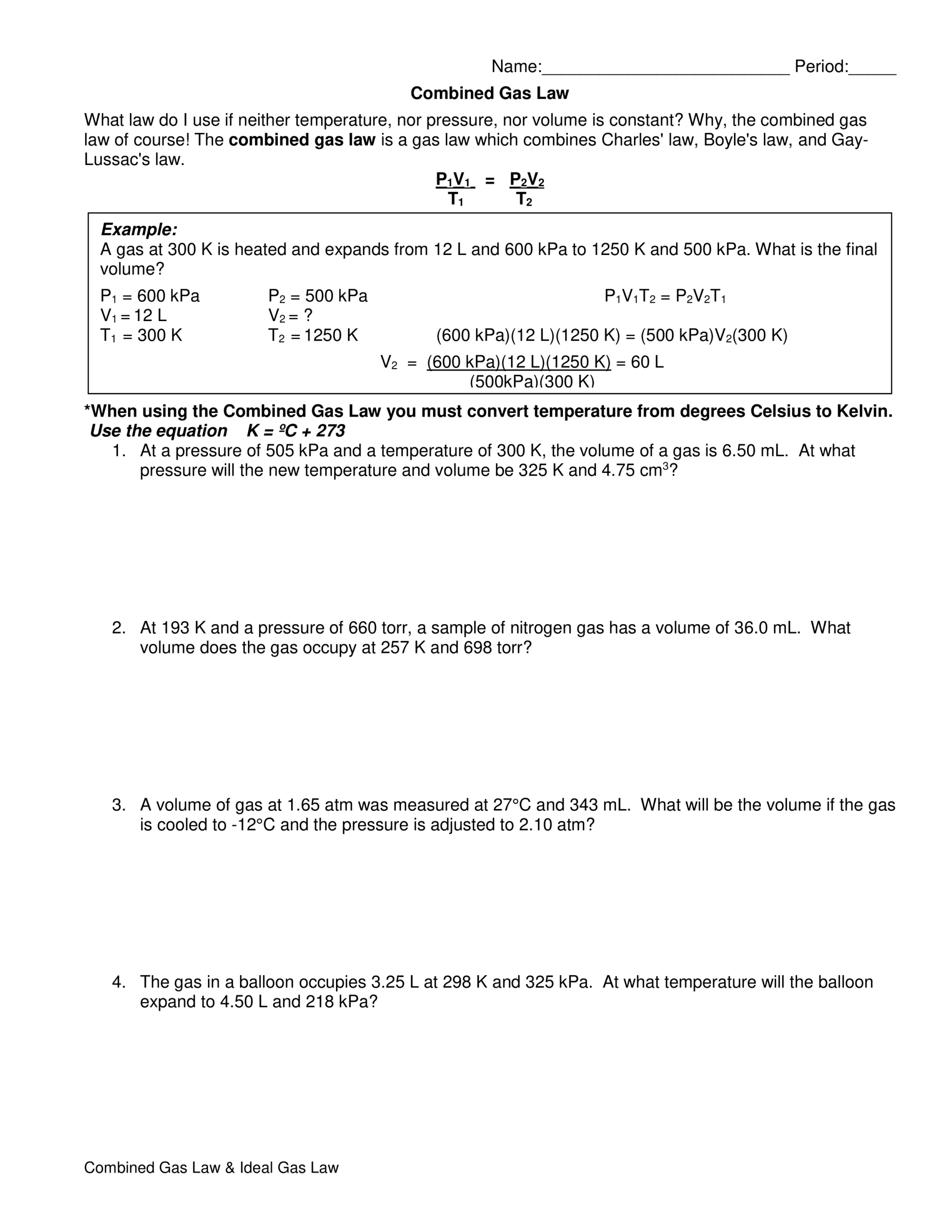 A combined gas law worksheet is a useful tool for students to practice applying this law to various scenarios. These worksheets typically involve solving for an unknown variable using the combined gas law equation, which is expressed as P1V1/T1 = P2V2/T2. By working through these problems, students can solidify their understanding of how pressure, volume, and temperature are interrelated in a gas sample.