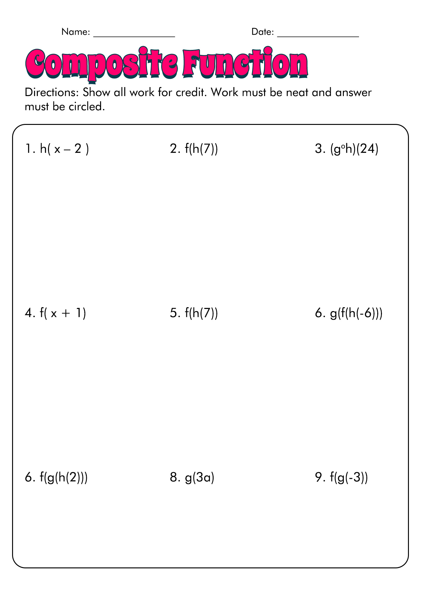 By working through a composite function worksheet, students can improve their skills in evaluating, simplifying, and composing functions. These worksheets provide a hands-on way for students to practice and apply the concepts they have learned in class, helping them to develop a deeper understanding of how functions work and how they can be combined to solve mathematical problems.