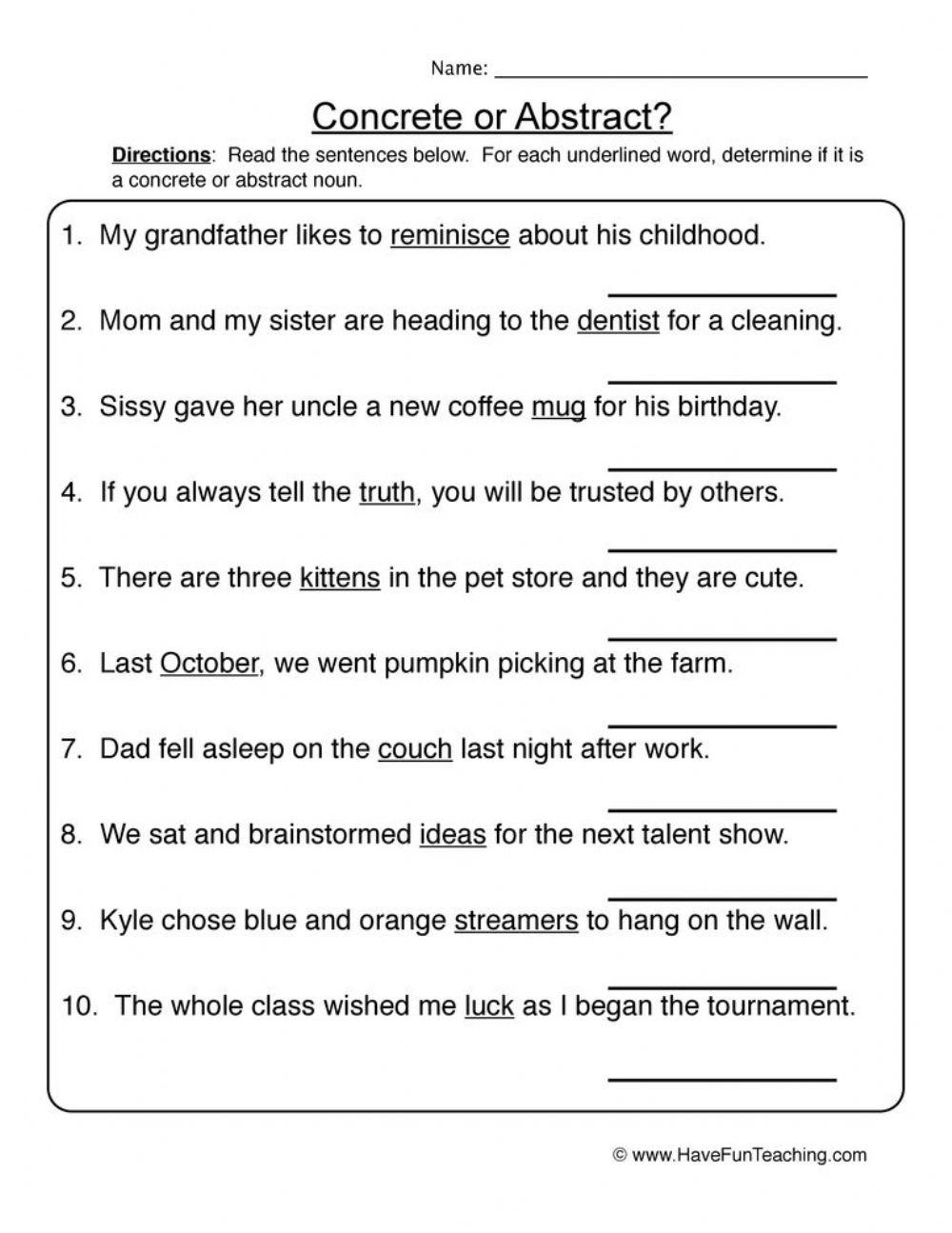 Understanding the difference between concrete and abstract nouns is crucial for developing strong writing skills. This worksheet will help students practice identifying and using both types of nouns in sentences.