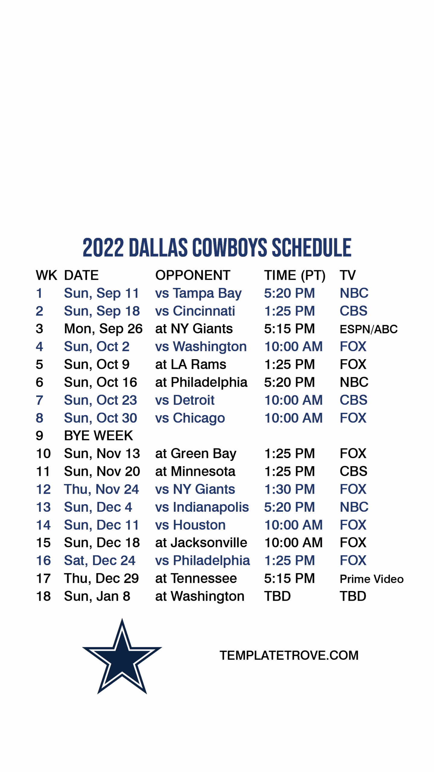 In conclusion, the Cowboys printable schedule is a valuable tool for any fan of America’s Team. Whether you’re planning your game-day parties or simply want to stay informed about upcoming matchups, having the schedule on hand can enhance your football-watching experience. So be sure to download or print out the schedule today and get ready to cheer on the Cowboys all season long!