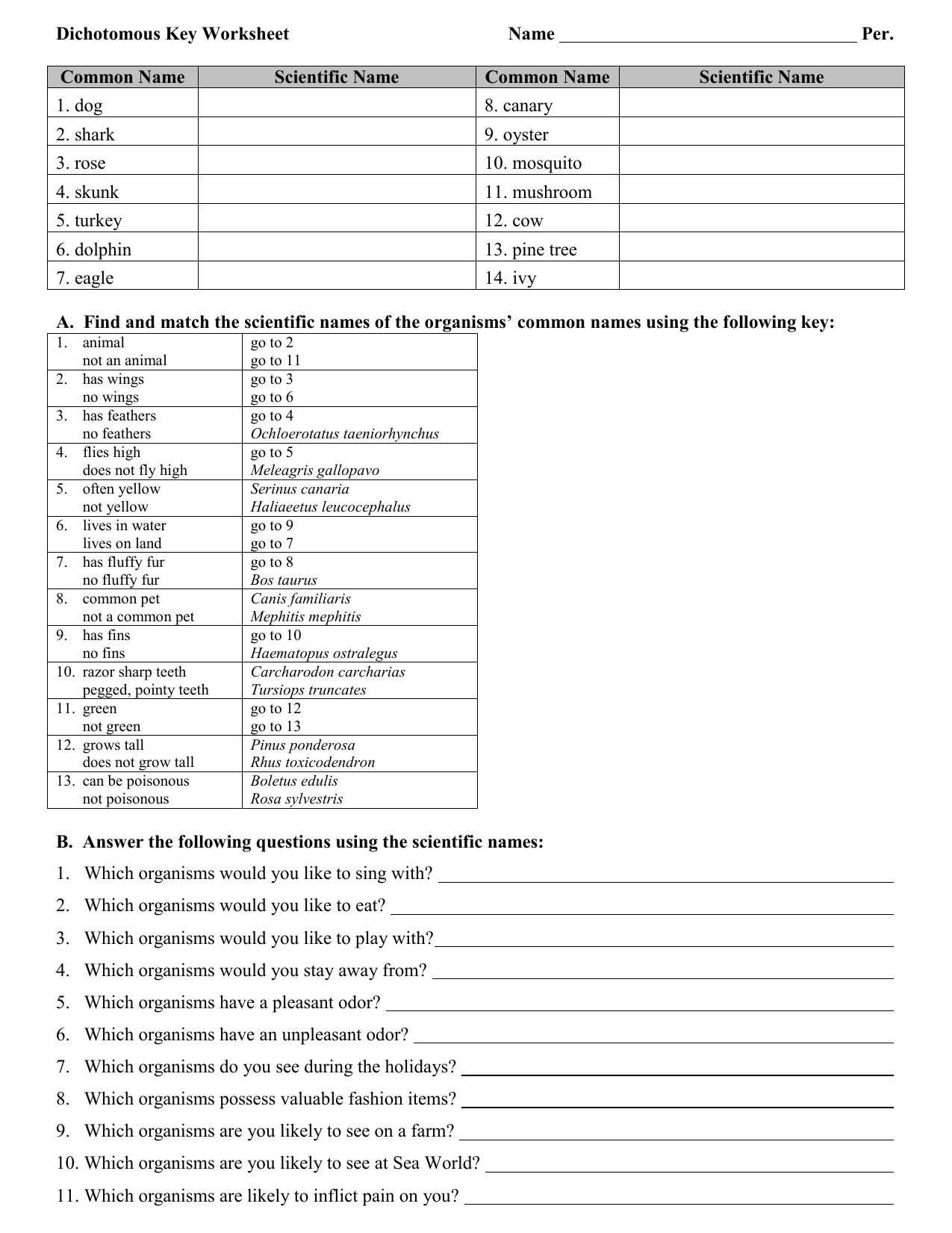 Dichotomous Key Worksheet