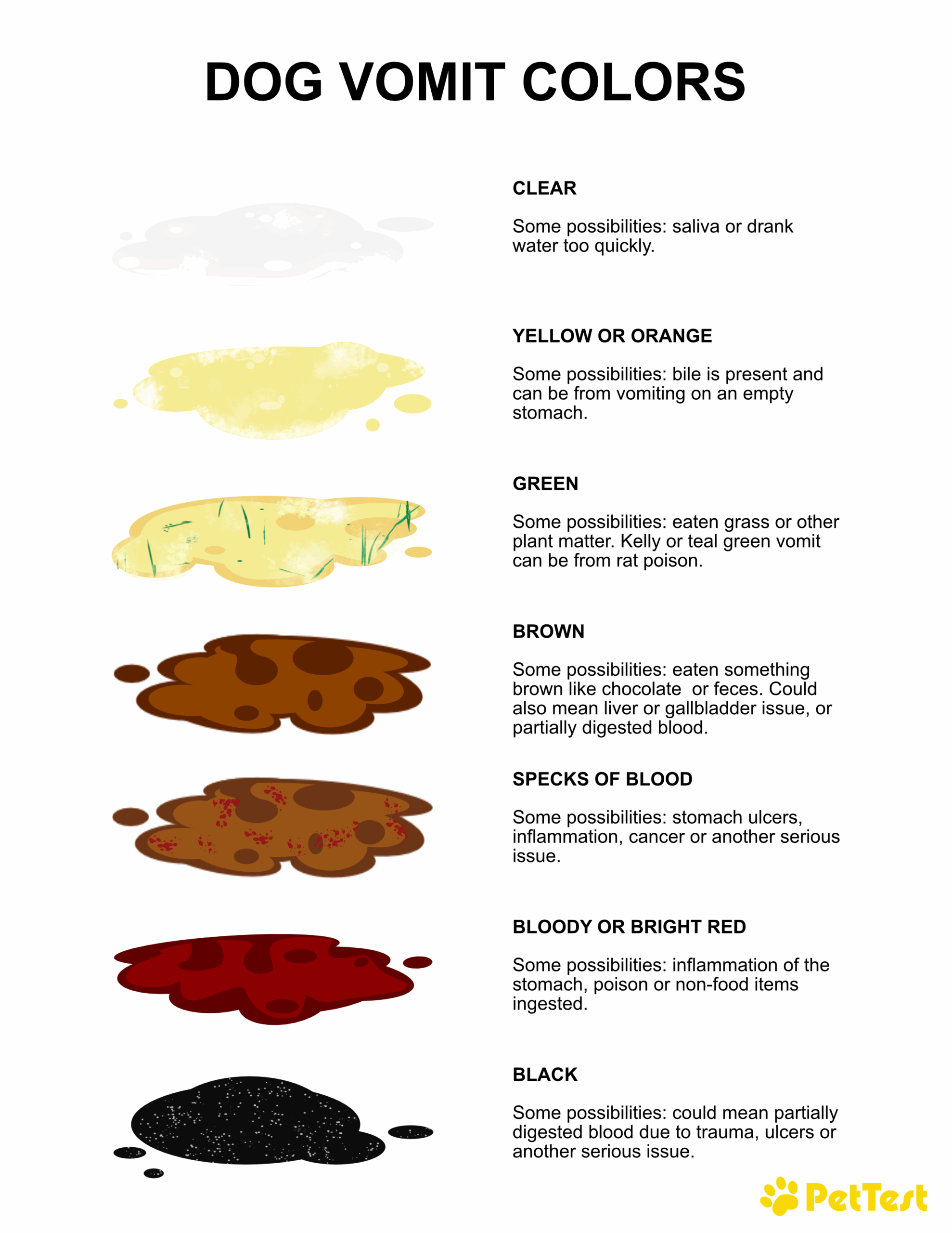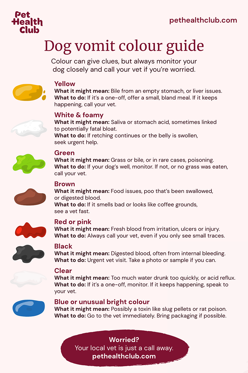 In conclusion, paying attention to the color of your dog’s vomit can provide valuable information about their health. While some colors may be less concerning, others can indicate serious issues that require prompt attention. If you’re unsure about the cause of your dog’s vomiting or if it persists, it’s always best to consult your vet for a proper evaluation and treatment.