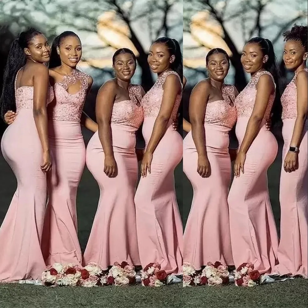 Elegant Blush Pink Bridesmaid Dresses Long One Shoulder Mermaid Gown With Lace Appliques And Beads Sweep Train Elastic Satin Maid Of Honor Dress