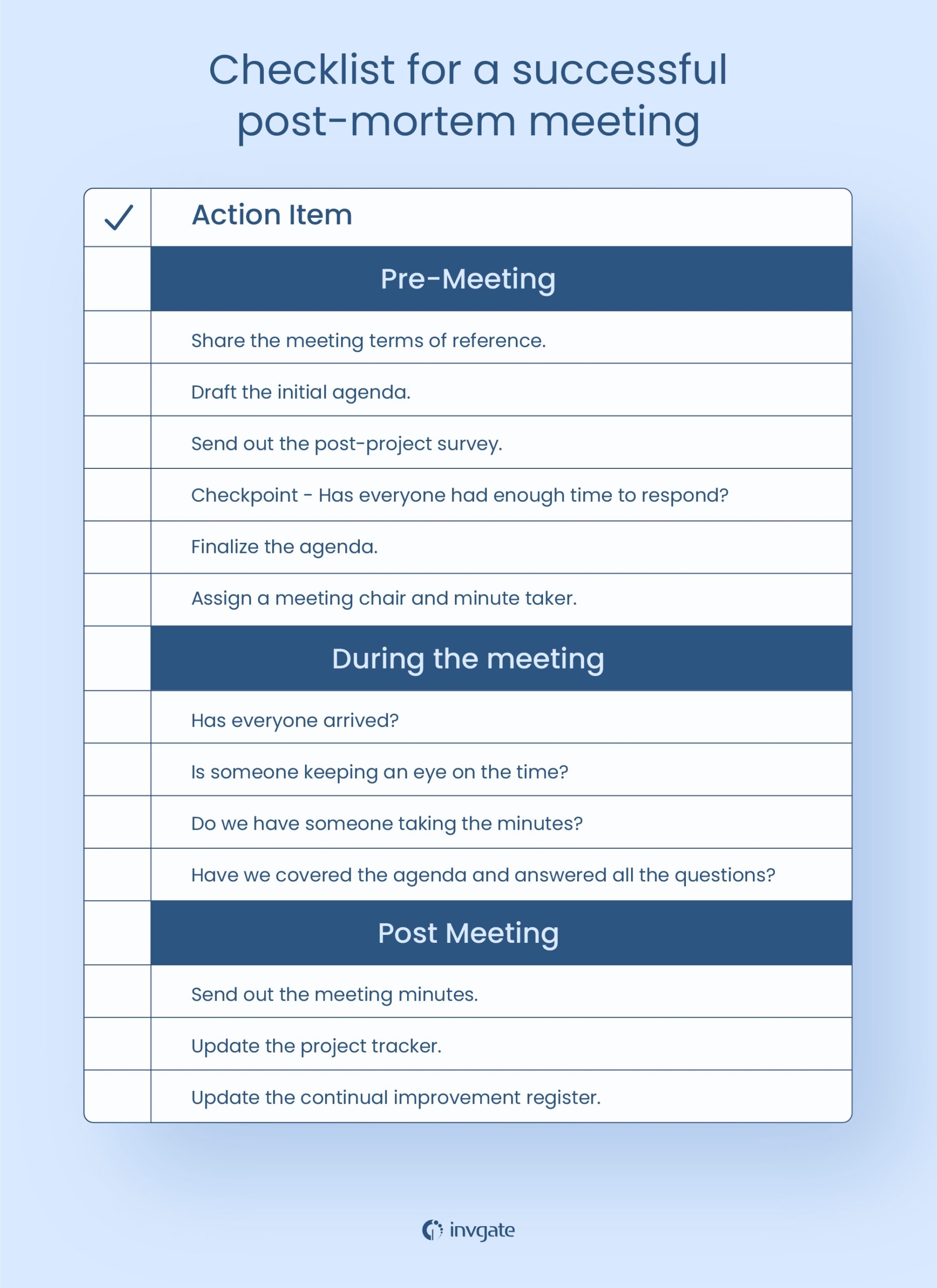5. Action Plan: Based on the discussions and insights gained from the post mortem, create a list of action items and recommendations for future events. Assign responsibilities and deadlines for implementing these improvements to ensure they are carried out effectively.