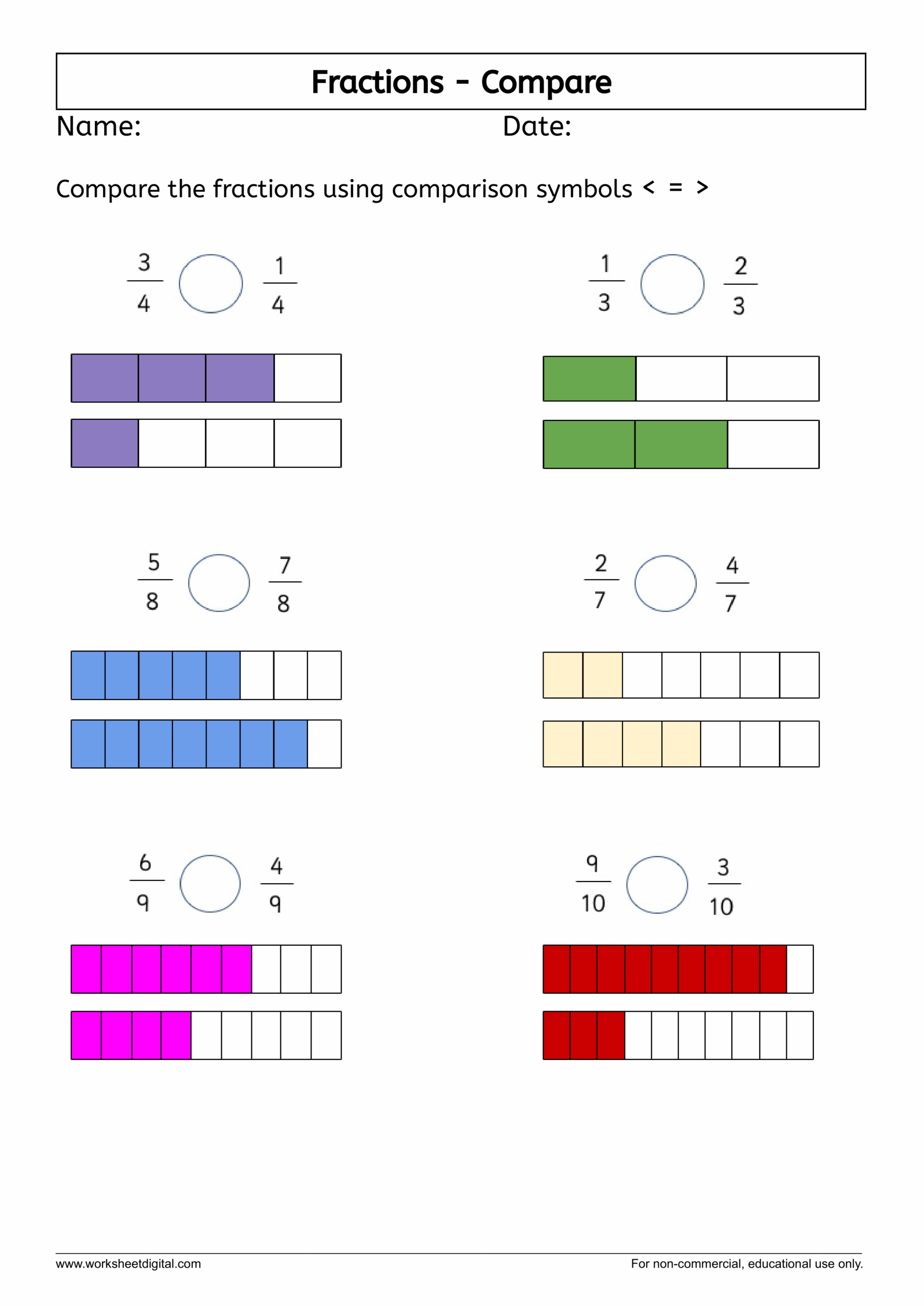One common type of fraction comparison worksheet presents students with a series of fractions and asks them to compare them using symbols such as <, >, or =. Students must determine which fraction is greater or lesser than the others, helping them to develop a sense of relative size when it comes to fractions. This type of worksheet is a great way for students to practice comparing fractions in a structured and systematic way.