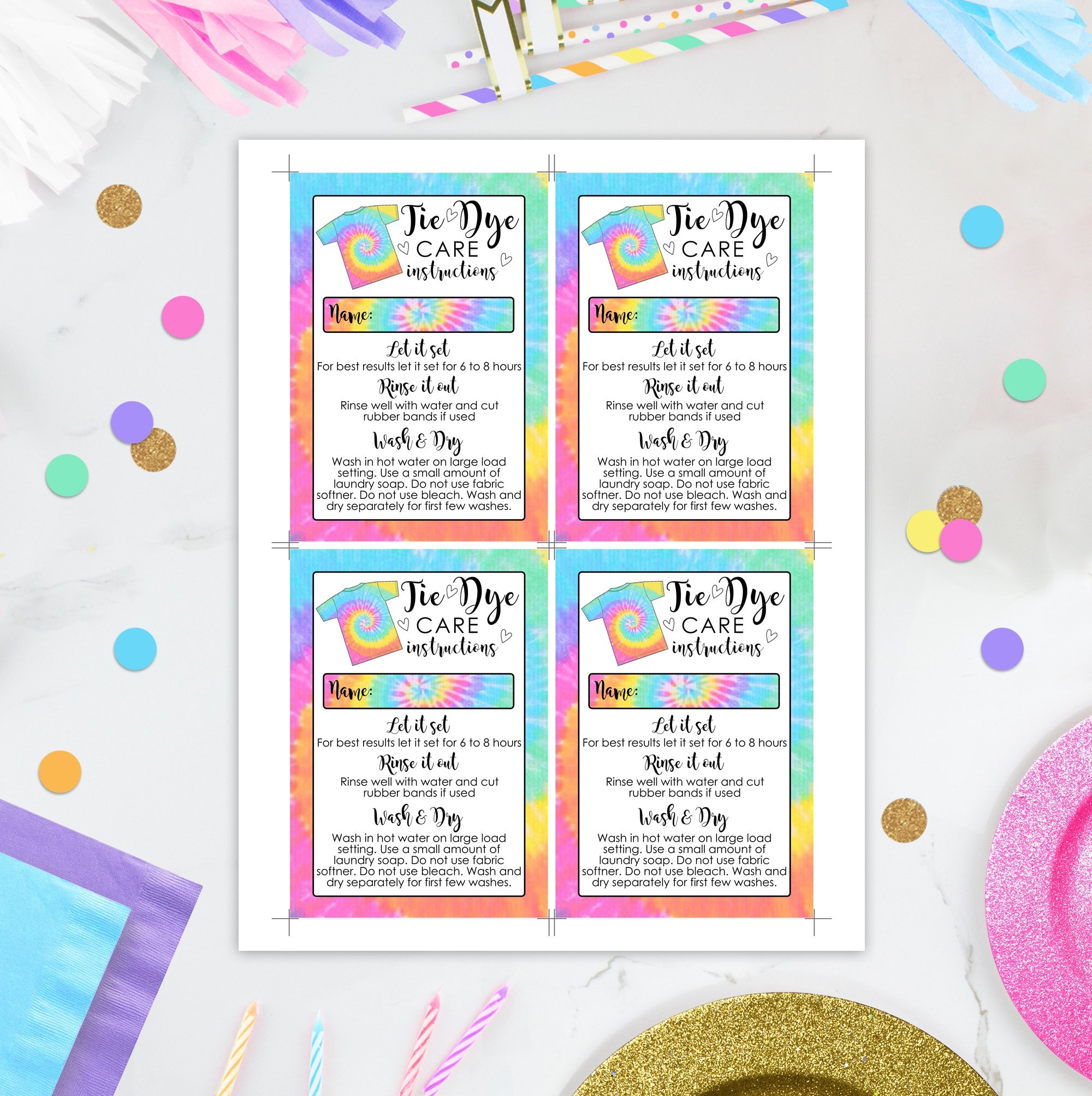 Tie dye is a fun and creative way to add some color to your wardrobe. Whether you’re a seasoned tie dye pro or just getting started, it’s important to know how to properly care for your tie dye creations to ensure they last as long as possible. To help you out, we’ve created a free template tie dye care instructions printable that you can use to keep track of the best practices for caring for your tie dye items.