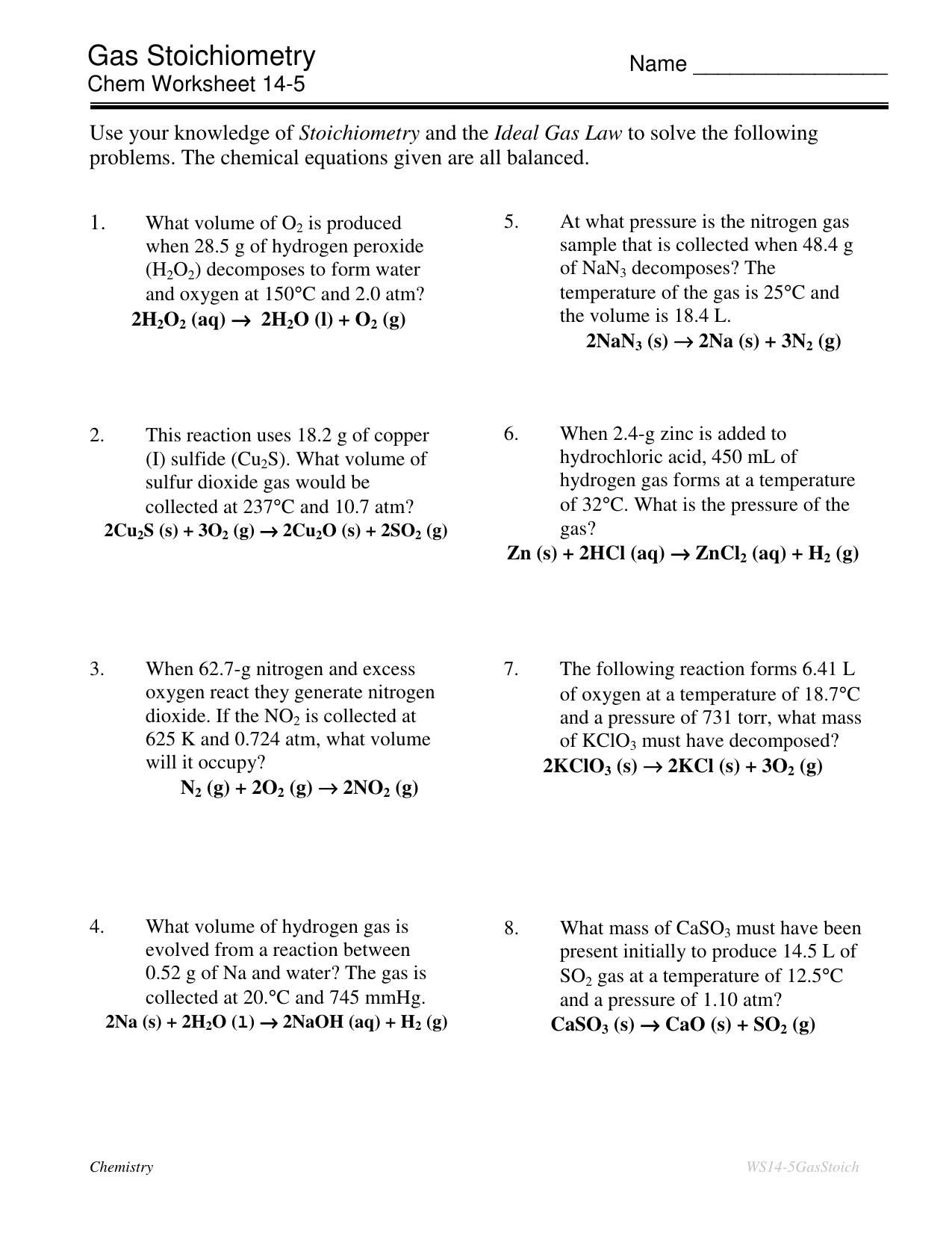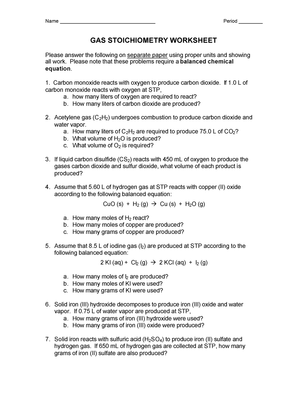 Gas stoichiometry is a branch of chemistry that deals with the relationships between the amounts of reactants and products in chemical reactions involving gases. A gas stoichiometry worksheet is a valuable tool for students to practice and master these concepts. By working through problems on the worksheet, students can improve their understanding of gas laws, stoichiometry, and reaction calculations.