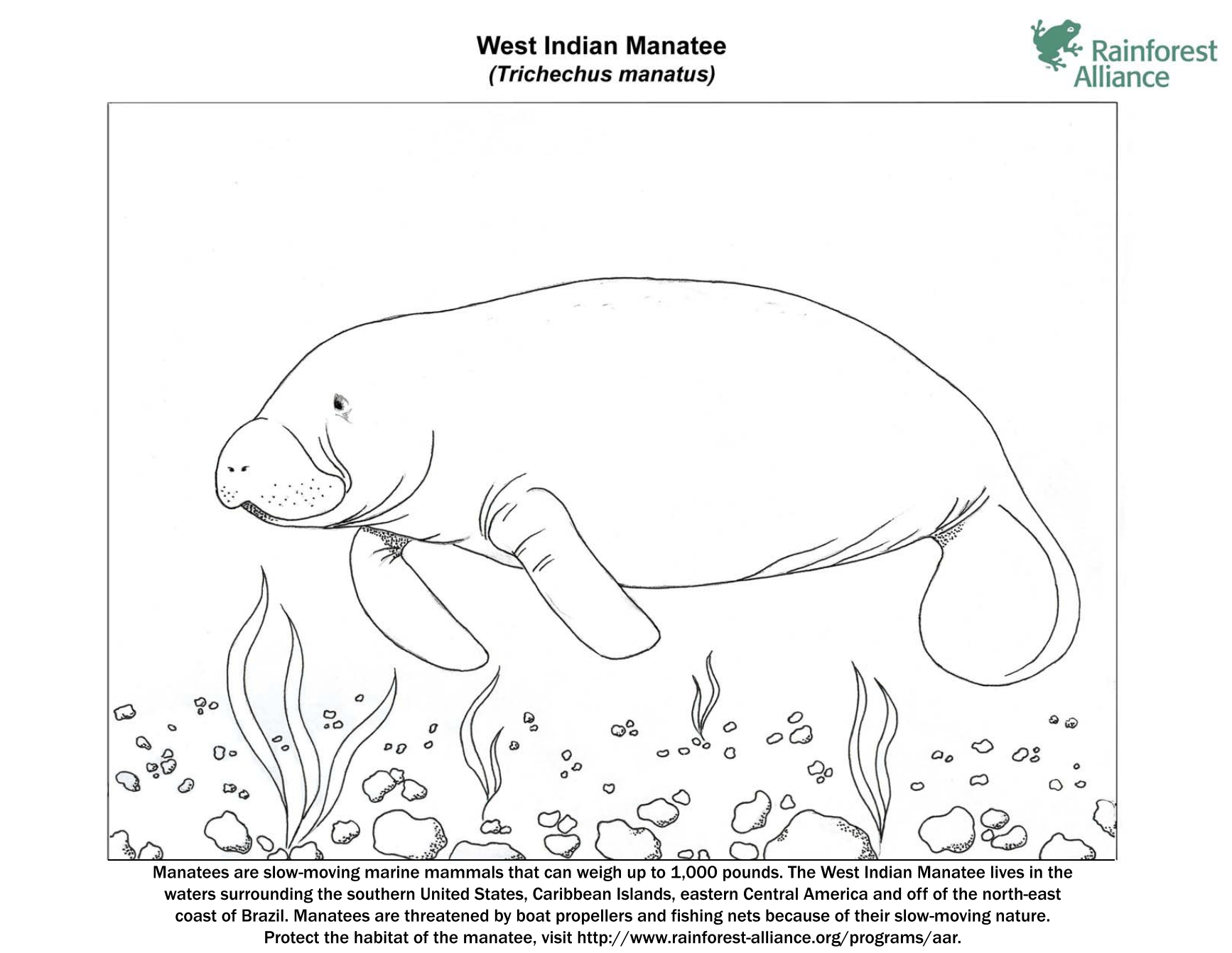 2. Manatee Family: This coloring page depicts a family of manatees floating together peacefully. You can use different shades of gray and brown to color each manatee, and add touches of green and blue for the surrounding seaweed and water.