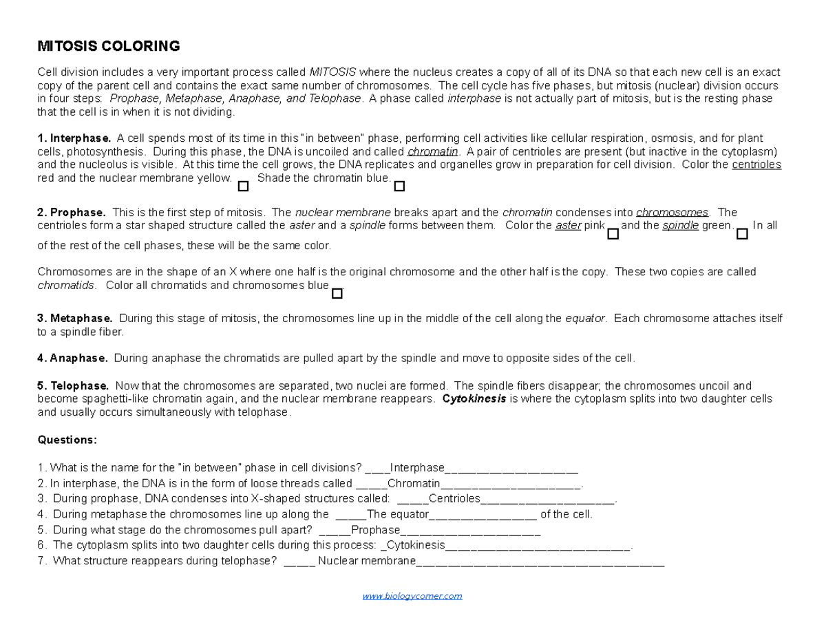 Are you looking for a fun and interactive way to learn about mitosis? Look no further than the mitosis coloring worksheet PDF! This educational resource combines the visual appeal of coloring with the scientific concepts of cell division, making it a great tool for students of all ages.