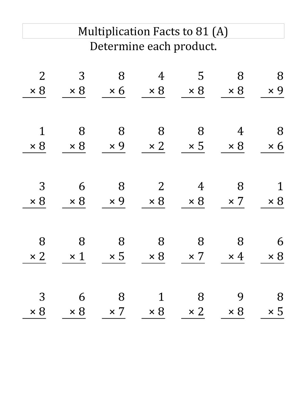Multiplication of 8 Worksheets