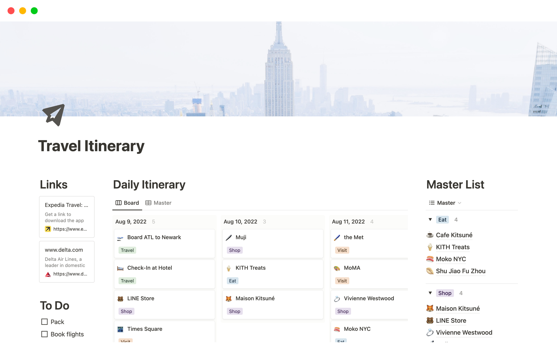With Notion’s travel plan template, you can create a detailed itinerary for your trip, including flights, accommodations, activities, and more. This template allows you to keep all your travel plans in one place, making it easy to access and update on the go.