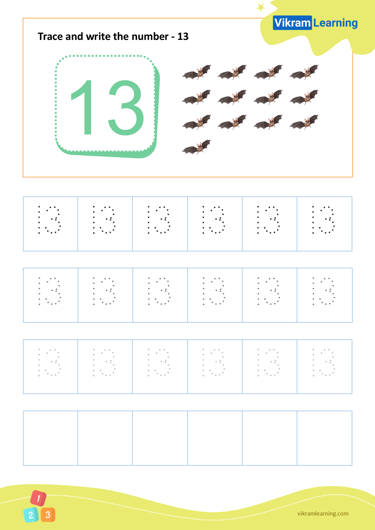 With this worksheet, children will have the opportunity to practice writing the number 13, counting objects up to 13, and identifying the number 13 in various contexts. This hands-on approach to learning numbers can help children develop their number recognition skills and build a strong foundation for future math success.