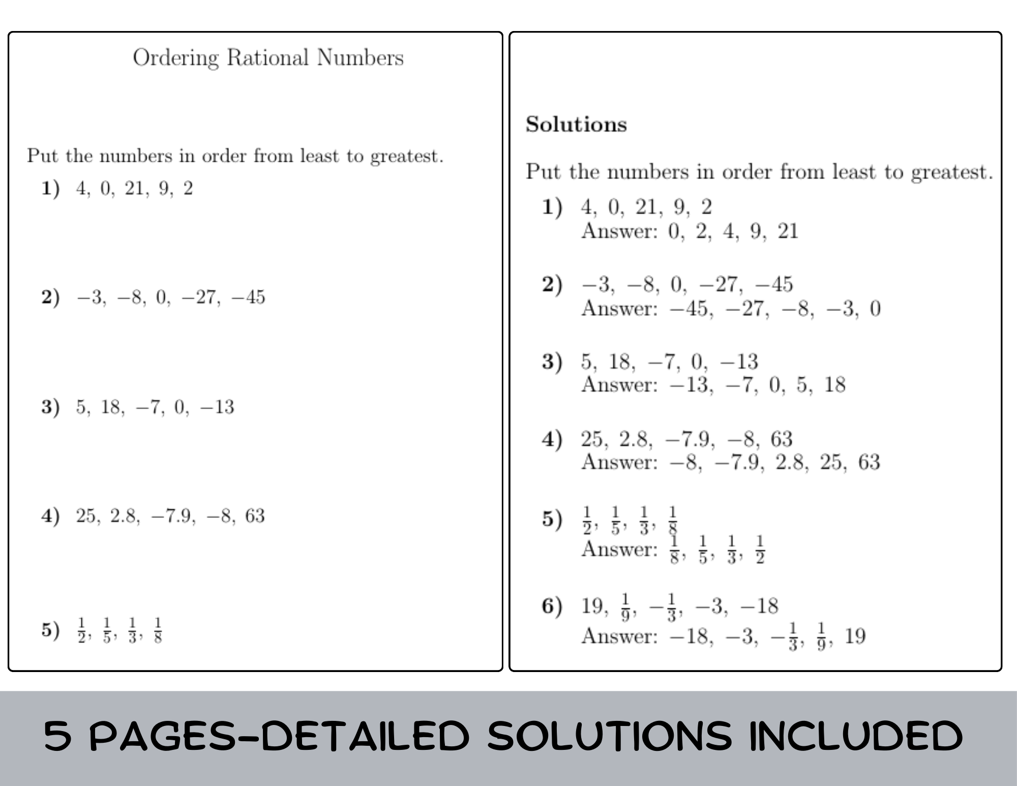 One helpful resource for practicing ordering rational numbers is a worksheet specifically designed for this purpose. These worksheets typically contain a variety of problems that require students to compare and order rational numbers in different forms, such as fractions, decimals, and mixed numbers.