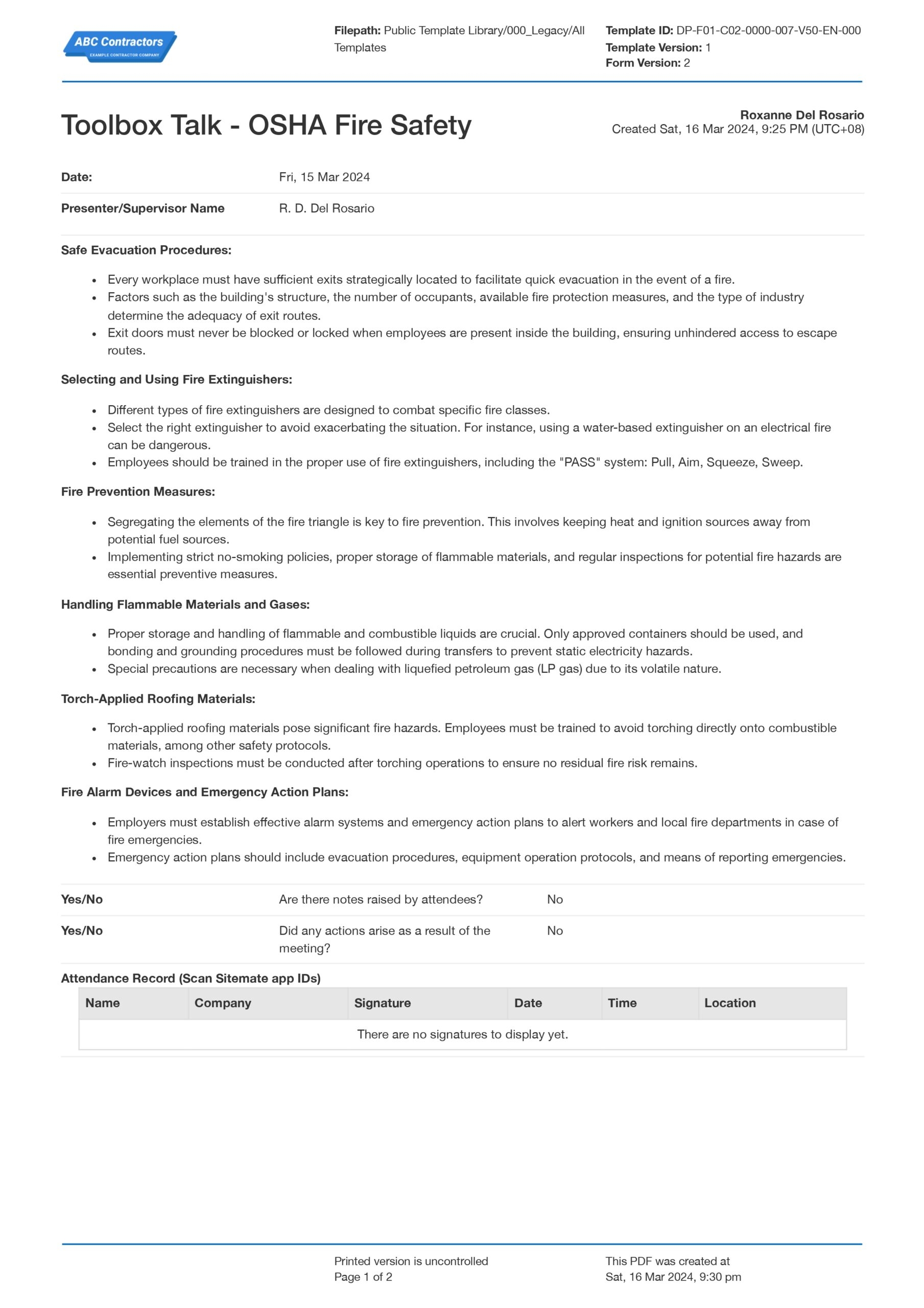 OSHA Fire Safety Toolbox Talk Download As PDF