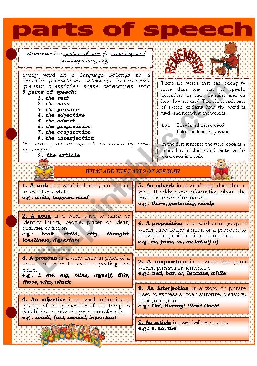 Whether you are a student looking to brush up on your grammar skills or a teacher seeking resources for your classroom, a parts of speech worksheet can be a valuable resource. These worksheets typically include exercises that require students to identify nouns, verbs, adjectives, adverbs, pronouns, prepositions, conjunctions, and interjections in sentences.