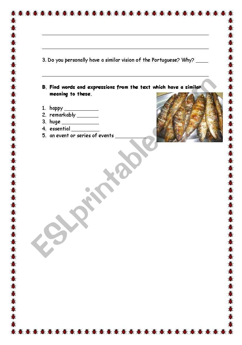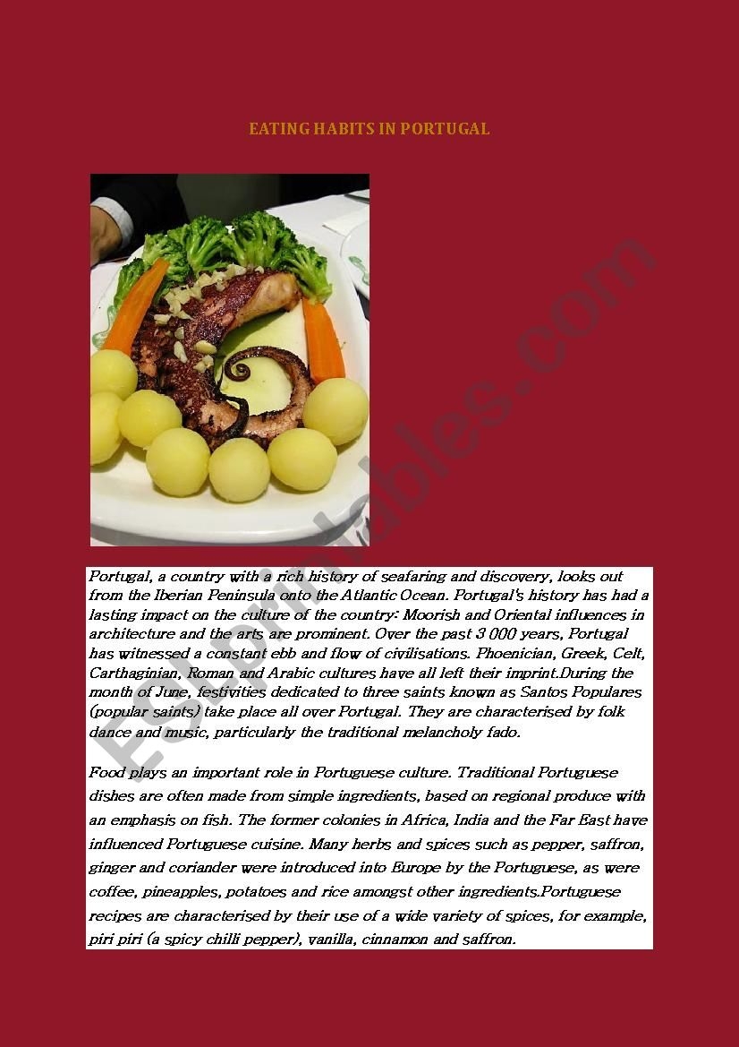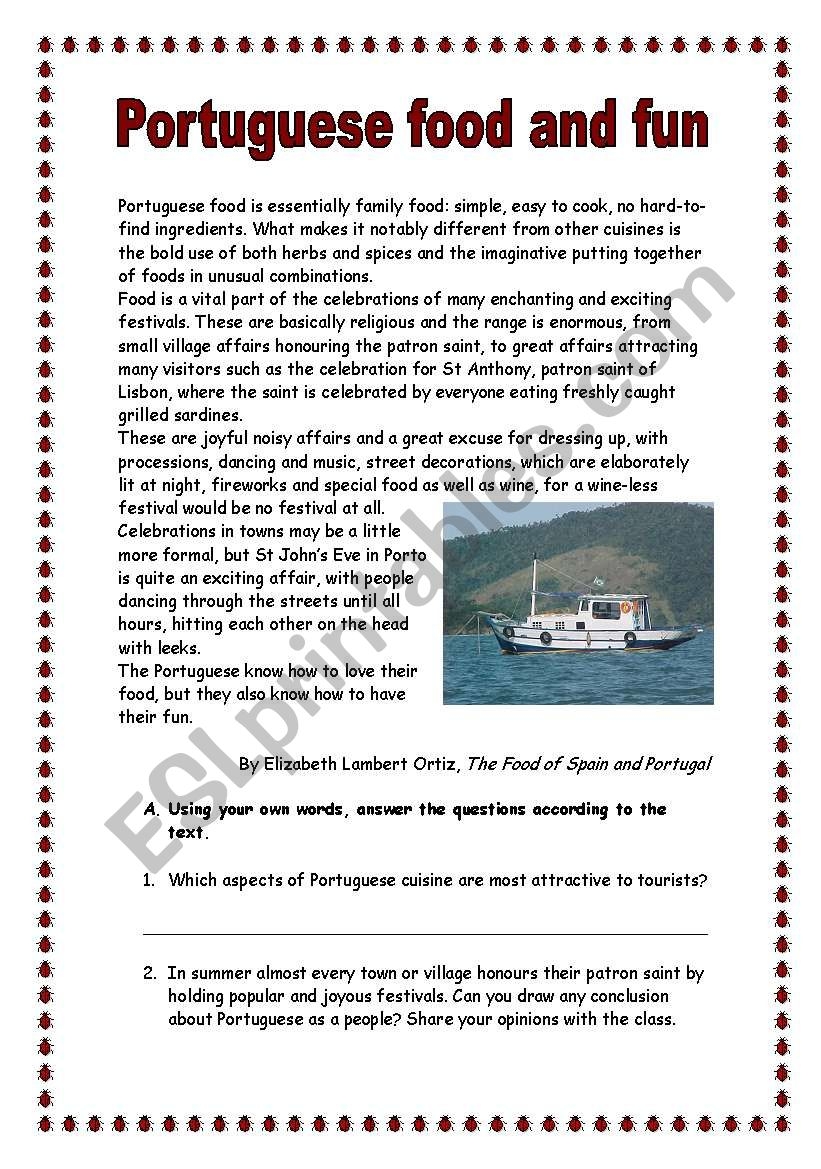 Food worksheets can also introduce students to the diverse regional specialties of Portugal. From the seafood-rich cuisine of the Algarve region to the hearty meat dishes of the Douro Valley, each region of Portugal has its own culinary traditions. Worksheets can provide insights into these regional specialties, allowing students to explore the varied flavors of Portuguese cuisine.