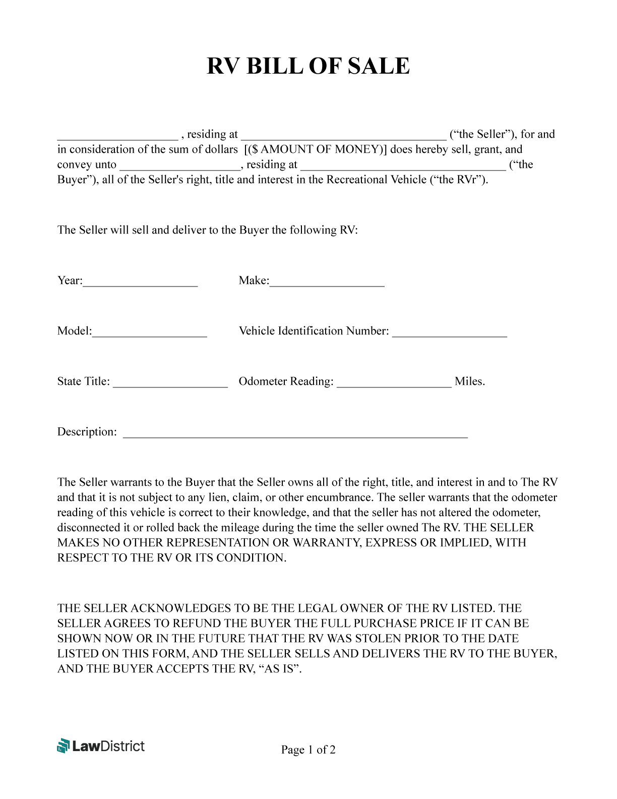 Recreational Vehicle Bill Of Sale Form LawDistrict