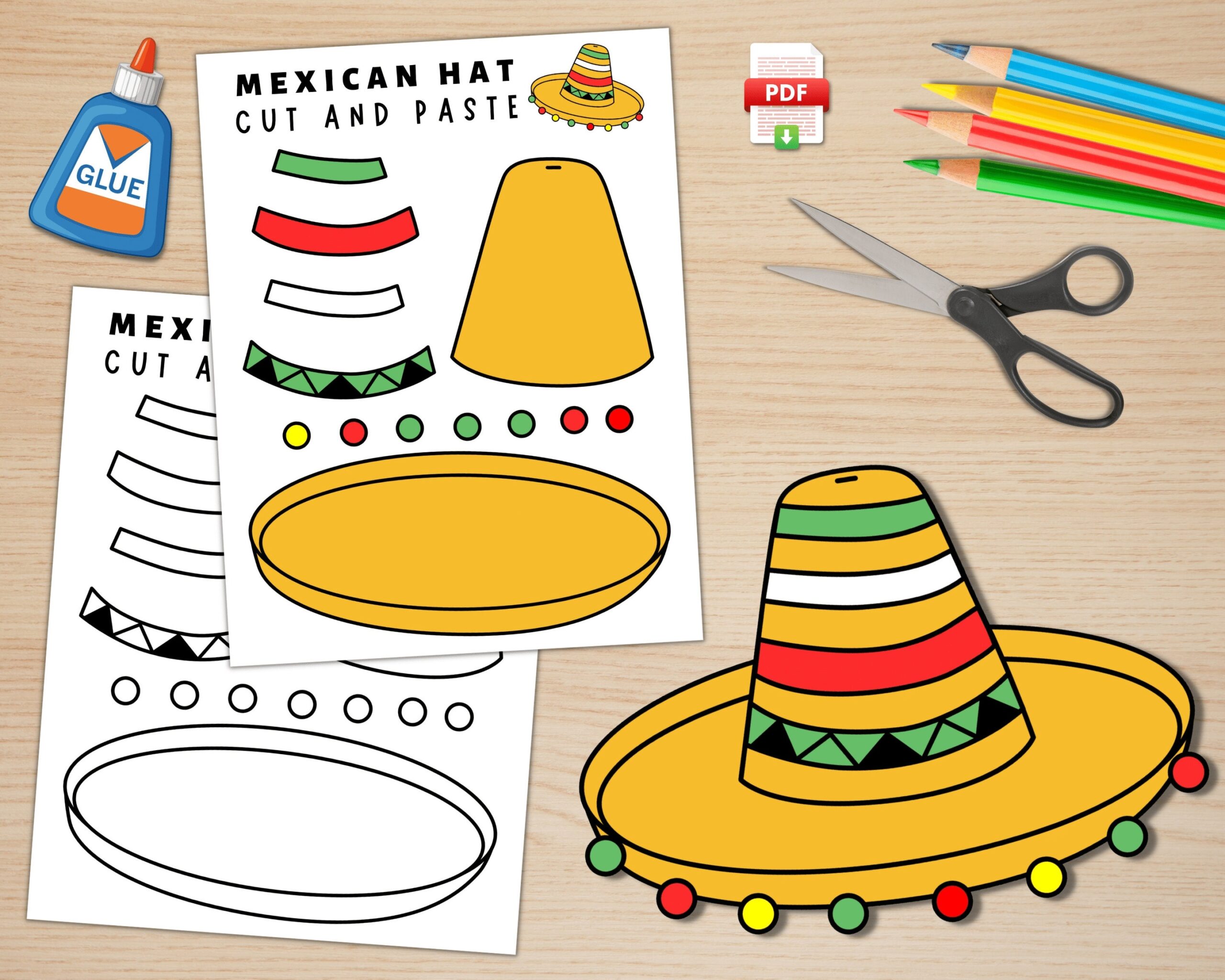 To make your own sombrero using a printable template, simply print the template on sturdy cardstock or construction paper. Cut out the template along the lines, then fold and assemble the pieces according to the instructions provided. You can also add extra embellishments such as colorful tissue paper, pom-poms, or sequins to make your sombrero unique.