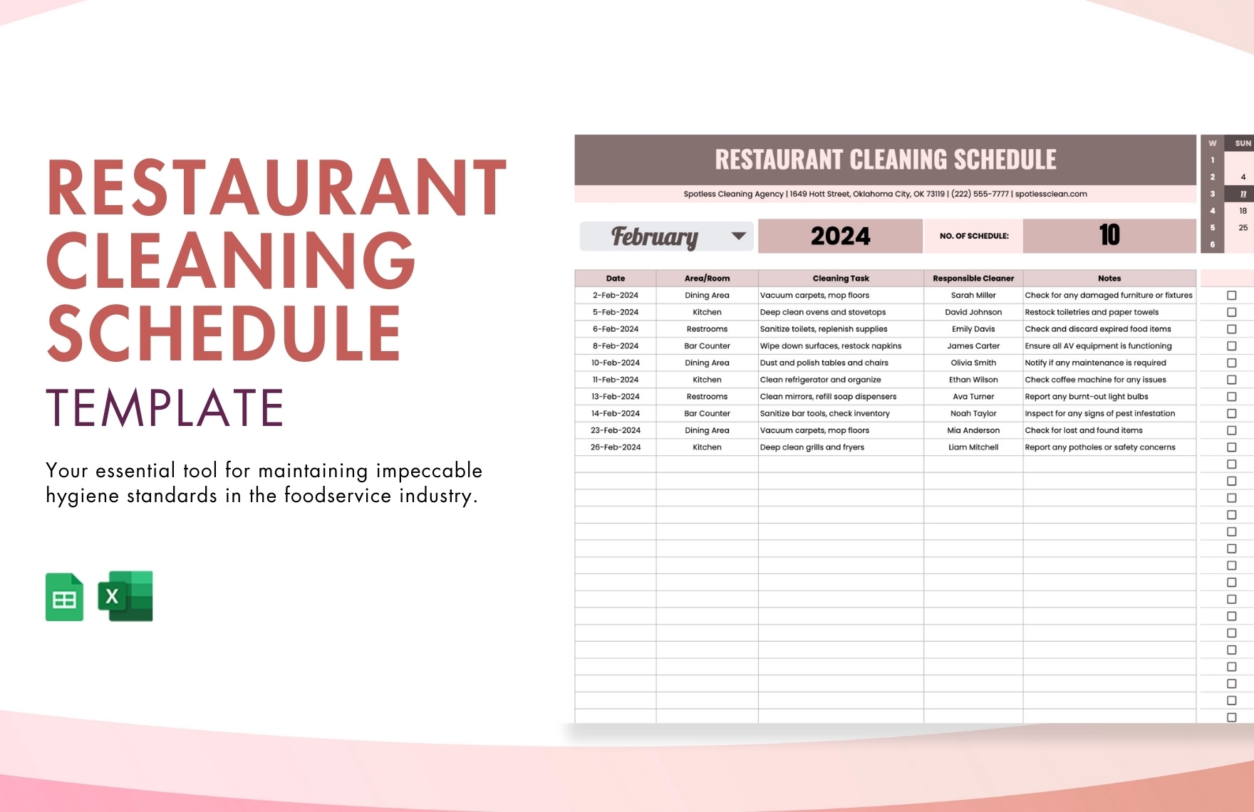 Here is a sample restaurant cleaning schedule template that you can use as a starting point for creating your own: