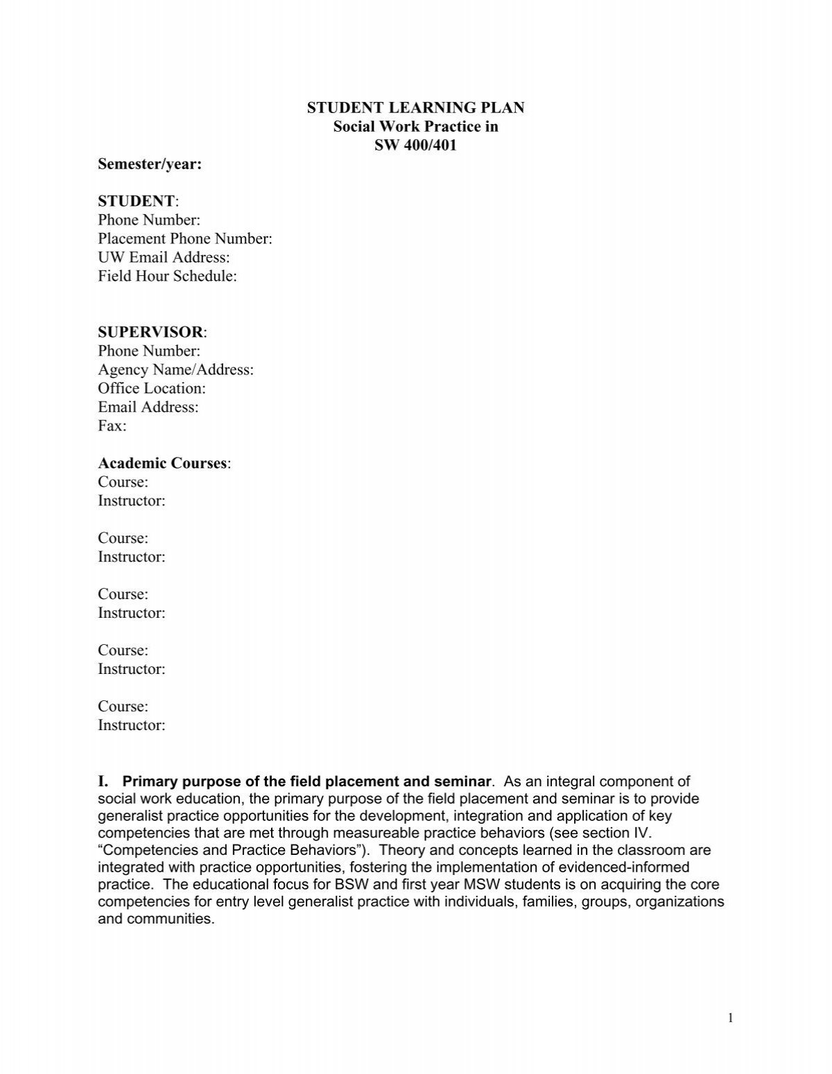 Student Learning Plan Template The School Of Social Work