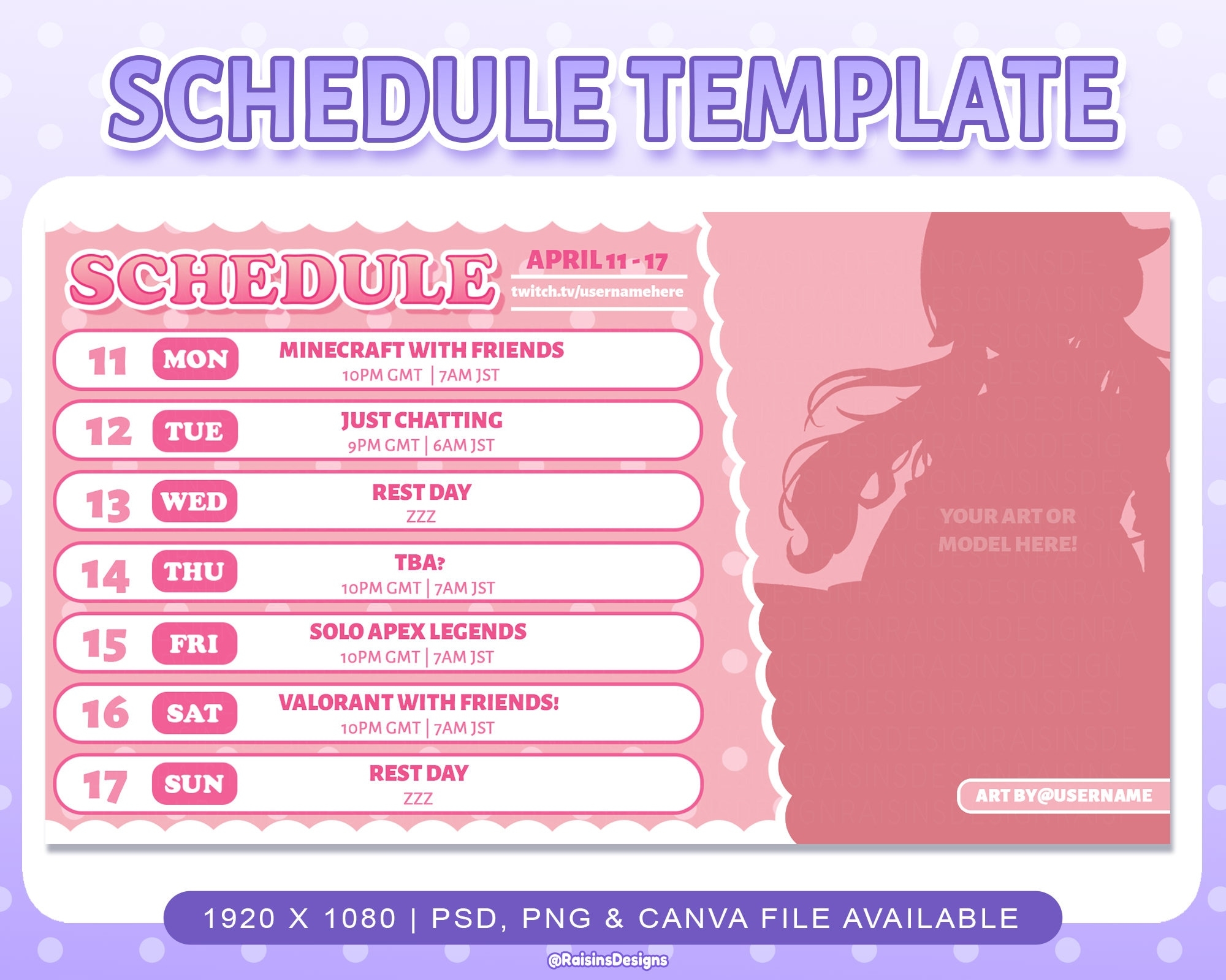 When creating a streaming schedule, it’s important to consider your availability, content goals, and audience preferences. Here is a simple template to help you get started: